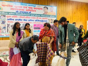 कानपुर नगर निगम के द्वारा आज दिनांक 19.12.2024 को मोतीझील स्थित प्रमिला सभागार में निःशुल्क एन्टी रैबीज वैक्सीनेशन कैम्प का आयोजन किया गया, जिसका शुभारम्भ श्रीमती प्रमिला पाण्डेय, मा0 महापौर के द्वारा किया गया। कैम्प में स्वान प्रेमियों को 300 डॉग मैटैªस, 100 रेडियम कॉलर एवं 200 काउ कोट का वितरण किया गया एवं श्वान प्रेमियो को सम्मानित भी किया गया। कार्यक्रम मे लगभग 200 से अधिक कुत्तो ’’जर्मन शेफर्ड, सिट्जू, लेब्रा, पॉमेलियन, पग, बीगल एवं अन्य प्रजातिया’’ का रजिस्टेªशन किया गया तथा 230 से अधिक कुत्तो का निःशुल्क टीकाकरण भी किया गया।