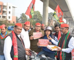 कानपुर, समाजवादी पार्टी के कार्यकर्ताओं ने समाजवादी व्यापार सभा के प्रदेश महासचिव अभिमन्यु गुप्ता व कानपुर ग्रामीण अध्यक्ष विनय कुमार के नेतृत्व में नवनिर्मित कानपुर मेट्रो विश्वविद्यालय स्टेशन के पास नारियल फोड़कर आम जन मानस में अखिलेश यादव ज़िन्दाबाद के नारों के साथ मिष्ठान वितरण करते हुए कानपुर मेट्रो को अखिलेश यादव का काम बताते हुए भाजपा पर झूठा श्रेय लेने का आरोप लगाया।नेतृत्व कर रहे व्यापार सभा के प्रदेश महासचिव अभिमन्यु गुप्ता ने बताया की 4 अक्टूबर 2016 को कानपुर मेट्रो का शिलान्यास तत्कालीन मुख्यमंत्री अखिलेश यादव ने किया था।कानपुर मेट्रो अब तैयार है।अखिलेश यादव के कामों का ही फीता काटने में माहिर प्रदेश की भाजपा सरकार फिर से 28 दिसम्बर को प्रधानमंत्री नरेंद्र मोदी के हाथों कानपुर मेट्रो का उद्घाटन करवाकर लोगों को गुमराह करना चाहती है और इसको अपना काम बताना चाहती है। अभिमन्यु गुप्ता ने कहा की 26 दिसम्बर को मुख्यमंत्री योगी आदित्यनाथ व 28 दिसम्बर को प्रधानमंत्री नरेंद्र मोदी का कानपुर दौरा है। उसमें वे मेट्रो निर्माण के लिए अखिलेश यादव जी को तो श्रेय देंगे नहीं।इसलिए आज पहले ही समाजवादियों ने नारियल फोड़कर जनता में मिष्ठान वितरण कर दिया है और जनता के बीच कानपुर मेट्रो के असली निर्माण कर्ता अखिलेश यादव को धन्यवाद दिया। अभिमन्यु गुप्ता ने कहा की व्यापारियों के टैक्स के पैसे को झूठे प्रचार में बहाया जा रहा है।प्रदेश महासचिव अभिमन्यु गुप्ता ने मांग रखी की एसपीएम हॉस्पिटल स्टेशन का नाम स्वतंत्रता संग्राम सेनानी या सेना में शहीद जवान के नाम पर होना चाहिए।व्यापार सभा के कानपुर ग्रामीण अध्यक्ष विनय कुमार ने कहा की भाजपा की सरकार राम नाम जपना दूसरे के काम को अपना बताने की पद्धति पर चलते हुए झूठे प्रचार के माध्यम से जनता को धोखा देने का काम कर रही है।भाजपा की सरकार ने एक भी काम खुद का नहीं किया।सिर्फ अखिलेश यादव के काम को ही अपना बताया है।जनता जानती है की प्रदेश में काम केवल समाजवादी पार्टी की सरकार द्वारा ही हुआ है।प्रदेश महासचिव अभिमन्यु गुप्ता, कानपुर ग्रामीण अध्यक्ष विनय कुमार,प्रदेश सचिव पिछड़ा प्रकोष्ठ लकी यादव,नरेश कटिहार,शेषनाथ यादव, आजाद खान, नितिन सिंह ,उपेंद्र यादव, वीरेंद्र निषाद, सोनू वर्मा ,मोहम्मद आतिफ , चंदन सिंह ,ऋषि कांत ,रवि कश्यप, अनुराग यादव ,छोटे अली आदि थे।