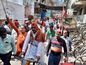 कानपुर। बढ़ती मंहगाई, बढ़ते पेट्रोल, डीजल,रसोई गैस के दामों एवं राष्ट्रीय अध्यक्ष अखिलेश यादव पर दर्ज फर्जी मुकदमे के विरोध में सपा के वरिष्ठ महासचिव अवधेश जायसवाल (टिल्लू) के संयोजन सैकड़ो कार्यकर्ताओ ने साईकिल यात्रा आयोजन भाग लिया ,यह यात्रा कानपुर के विभिन्न मोहल्लों से बिरहाना रोड, सिरकी मोहाल, कमला टावर, फीलखाना, घसियारी मंडी, हरबंस मोहाल, हूलागंज भूसाटोली, तेलियाना, गणेश मंदिर, नयागंज होते हुए वापस दालमंडी में इसका समापन हुआ ,इस साईकिल यात्रा में आर्यनगर विधायक अमिताभ बाजपेई ने सपा के राष्ट्रीय अध्यक्ष अखिलेश यादव पर दर्ज मुकदमे के विरोध में खुद को बेड़ियों से बांधकर साइकिल चलाकर अपना विरोध दर्ज किया।