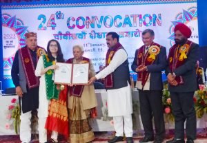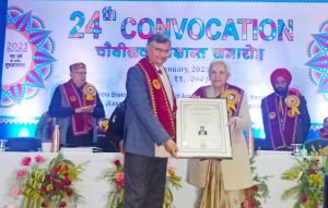 चंद्रशेखर आजाद कृषि एवं प्रौद्योगिकी विश्वविद्यालय कानपुर के ऑडिटोरियम हॉल (कैलाश भवन) में आज कुलाधिपति एवं उत्तर प्रदेश की श्री राज्यपाल आनंदीबेन पटेल जी की अध्यक्षता में 24 वें दीक्षांत समारोह का कार्यक्रम आयोजित किया गया। इस अवसर पर 60 मेधावियों को पदक एवं पुरस्कार दिए गए।कुल 577 छात्र छात्राओं को उपाधियां प्रदान की गई।उपाधियां और मेडल पाकर छात्र-छात्राएं झूम उठे। सर्वश्रेष्ठ प्रदर्शन करने वाले 14 छात्र छात्राओं को कुलाधिपति स्वर्ण पदक तथा 14 छात्र-छात्राओं को विश्वविद्यालय रजत पदक, 14 छात्र छात्राओं को विश्वविद्यालय कांस्य पदक एवं 18 छात्र छात्राओं को प्रायोजित स्वर्ण पदक से नवाजा गया। प्रदेश की राज्यपाल और कुलाधिपति श्रीमती आनंदीबेन पटेल, मुख्य अतिथि प्रोफेसर रमेश चंद्र मा. सदस्य नीति आयोग नई दिल्ली और विशिष्ट अतिथि श्री सूर्य प्रताप शाही मा. मंत्री कृषि,कृषि शिक्षा एवं अनुसंधान उत्तर प्रदेश सरकार तथा मा. राज्यमंत्री कृषि, कृषि शिक्षा एवं अनुसंधान श्री बलदेव सिंह औलख जी एवं विश्वविद्यालय के कुलपति डॉक्टर डी.आर. सिंह ने मेधावियों को पदक दिए। इस दौरान पीएचडी डिग्री धारकों की तस्वीर कुलाधिपति महोदया एवं अतिथियों के साथ ली गई। इस अवसर पर एक से अधिक पदक कई छात्र छात्राओं को मिले। इस अवसर पर प्रोफेसर रमेश चंद मा. सदस्य नीति आयोग को कुलाधिपति महोदया द्वारा मानद उपाधि से विभूषित किया गया। राज्यपाल एवं कुलाधिपति महोदया द्वारा इस अवसर पर विश्वविद्यालय द्वारा गोद लिए गए प्राथमिक विद्यालय नवीन रावतपुर के 25 छात्र-छात्राओं को पुस्तकें, दलिया, पेन, फल एवं बैग आदि भेंट की। तथा प्राथमिक विद्यालय की छात्राओं द्वारा सांस्कृतिक कार्यक्रम भी प्रस्तुत किया गया। इस अवसर पर सर्वप्रथम कुलाधिपति महोदया एवं अतिथियों द्वारा जल संरक्षण के महत्व हेतु प्रेरित कर कार्यक्रम की शुरुआत की। सर्व प्रथम कुलपति ने विश्वविद्यालय की प्रगति आख्या प्रस्तुत की। तथा शिक्षण, शोध एवं प्रसार कार्यों के नवाचारो के बारे में विस्तार से जानकारी दी। इस अवसर पर मुख्य अतिथि प्रोफेसर रमेश चंद मा. सदस्य नीति आयोग ने सभी पदक व उपाधि प्राप्त छात्र-छात्राओं को शुभकामनाएं दी। उन्होंने अपने उद्बोधन में कहा कि इस विश्वविद्यालय द्वारा दलहन, तिलहन एवं खाद्यान्न फसलों की 300 से अधिक प्रजातियां निकालकर कृषि क्षेत्र में कीर्तिमान स्थापित किया है।तथा इस विश्वविद्यालय द्वारा विभिन्न शस्य जलवायु क्षेत्रों के लिए 500 से अधिक शस्य तकनीकों को भी विकसित किया है। जो किसानों की आय बढ़ाने में सहायक है ।उन्होंने गुणवत्ता युक्त कृषि उत्पाद के लिए कृषि विविधीकरण पर बल दिया। इस अवसर पर कुलाधिपति एवं श्रीराज्यपाल श्रीमती आ