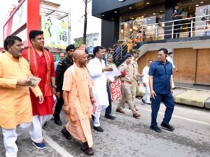 ‘जीएसटी रिफॉर्म जागरूकता अभियान’ के तहत मुख्यमंत्री योगी आदित्यनाथ ने झूलेलाल मंदिर से गोरखनाथ मंदिर मार्ग तक पदयात्रा की और मार्ग पर स्थित कई दुकानों में जाकर व्यापारियों और ग्राहकों से मुलाकात की। इस दौरान उन्होंने जीएसटी की घटी दरों को लेकर उनसे संवाद किया। उन्हें जीएसटी की घटी दरों से संबंधित एक स्टीकर और गुलाब का फूल दिया। साथ ही कहा कि जीएसटी की घटी दरों का लाभ ग्राहकों को जरूर दीजिए। इससे आपका कारोबार और समृद्ध होगा।