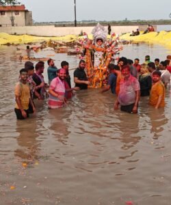 कानपुर। किदवई नगर स्थित श्री श्री शारदीय दुर्गा पूजा (किदवई पार्क) पंडाल में विजयदशमी के अवसर पर महिलाओं ने सिंदूर खेला की परंपरा निभाई। मां दुर्गा की विदाई से पहले पंडाल में मां का पान के पत्तों से पूजा अर्चन किया गया। इसके बाद उनका मिष्ठान से मुंह मीठा करा महिलाओं ने उनकी मांग में सिंदूर भरा। इस दौरान मां दुर्गा की जयकारों से पंडाल गूंज उठा। पंडाल में बंगाली परिधानों में सज संवर कर आई महिलाओं ने मां की पूजा अर्चना की। पूजा अर्चना के बाद सिंदूर खेला का आयोजन किया गया। जिसमें महिलाओं ने एक दूसरे की मांग व गाल में लाल रंग का सिंदूर लगाया। ढाक की थाप पर महिलाओ ने जमकर नृत्य किया। नाच गानों के दौरान महिलाओं ने मां की प्रतिमा को भी रंग गुलाल से सराबोर कर दिया। मां की प्रतिमा जयकारों के साथ पंडाल से उठी तो भक्त भाव विभोर हो गए। जयकारों के बीच कई महिलाओं की आंखों से आंसू छलक पड़े। नम आंखों से भक्तगण मां दुर्गा की प्रतिमा को गंगा घाट की ओर लेकर चल दिए। गंगा घाट पहुंचकर श्रद्धालुओं ने मां को नम आंखों से विदाई दी और अगले बरस जल्द आने की कामना की। इस दौरान चेयरमैन उग्रसेन सिंह, अध्यक्ष शुभंकर मुखर्जी, महामंत्री शैलेंद्र प्रताप सिंह, सुरजीत गुहा, देवदत्त बक्शी, वीरेंद्र गुप्ता मन्नी, नरेश पाठक, संतोष सैनी, शिवम सेठ, पंकज यादव, मानस, बाबू, रवि सोनकर, कल्लू आदि सैकड़ों महिलाएं मौजूद रहीं।