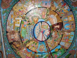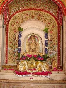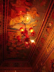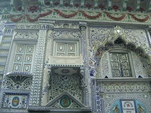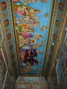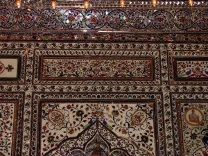 मंदिर के दीवारों पर कांच के रंग-बिरंगे वास्तु कला पर आधारित, जिन्हें दर्पण से सजाया गया है|